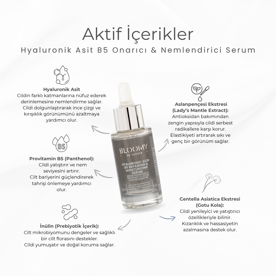 Bloomy By Nature Hyaluronik Asit B5 Onarıcı & Nemlendirici Serum, farklı moleküler ağırlıklara sahip çeşit Hyaluronik Asitler ile cildin hem yüzeyini hem de derin katmanlarını nemlendirerek yoğun bir bakım sunar. Provitamin B5 (Panthenol) ile cilt bariyerini güçlendirir, yatıştırır ve onarım sürecine destek olur. Aslanpençesi Ekstresi ve Centella Asiatica Ekstresi gibi güçlü bitkisel içerikler sayesinde cilt elastikiyetini artırırken, yaşlanma belirtilerini azaltmaya yardımcı olur.
