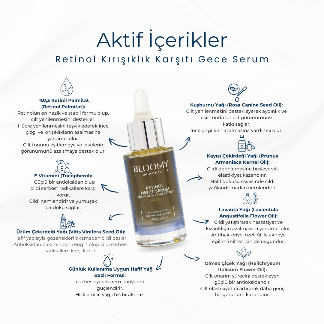 • Retinol Kırışıklık Karşıtı Gece Serumu – İnce çizgi ve kırışıklık görünümünü azaltmaya yardımcı olur.