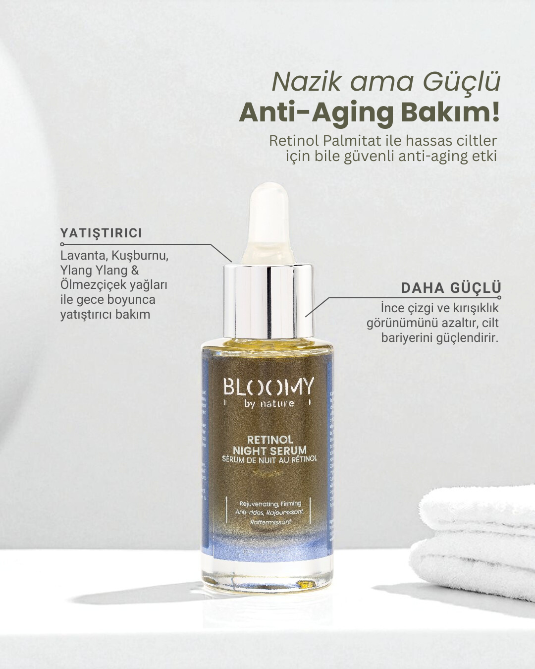Bloomy By Nature Retinol Kırışıklık Karşıtı Gece Serumu, %0,3 Retinil Palmitat (Retinol Palmitat) ve E Vitamini içeriğiyle yaşlanma karşıtı güçlü bir bakım sunar.; Retinil Palmitat, retinoid ailesinin en stabil ve nazik formlarından biri olup cilt yenilenmesini destekler, ince çizgi ve kırışıklıkları azaltmaya yardımcı olur.; Formülde yer alan doğal yağlar cildi derinlemesine besler ve bariyerini güçlendirirken, hafif ve hızla emilen yapısıyla ciltte yağlı bir his bırakmaz.; Üzüm çekirdeği yağı, kuşburnu yağı, kayısı çekirdeği yağı, lavanta yağı ve ölmez çiçek yağı gibi güçlü antioksidan ve besleyici içerikler, cildi besleyerek aydınlık ve sağlıklı bir görünüm kazandırır.